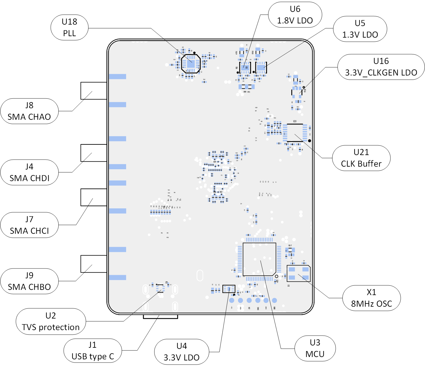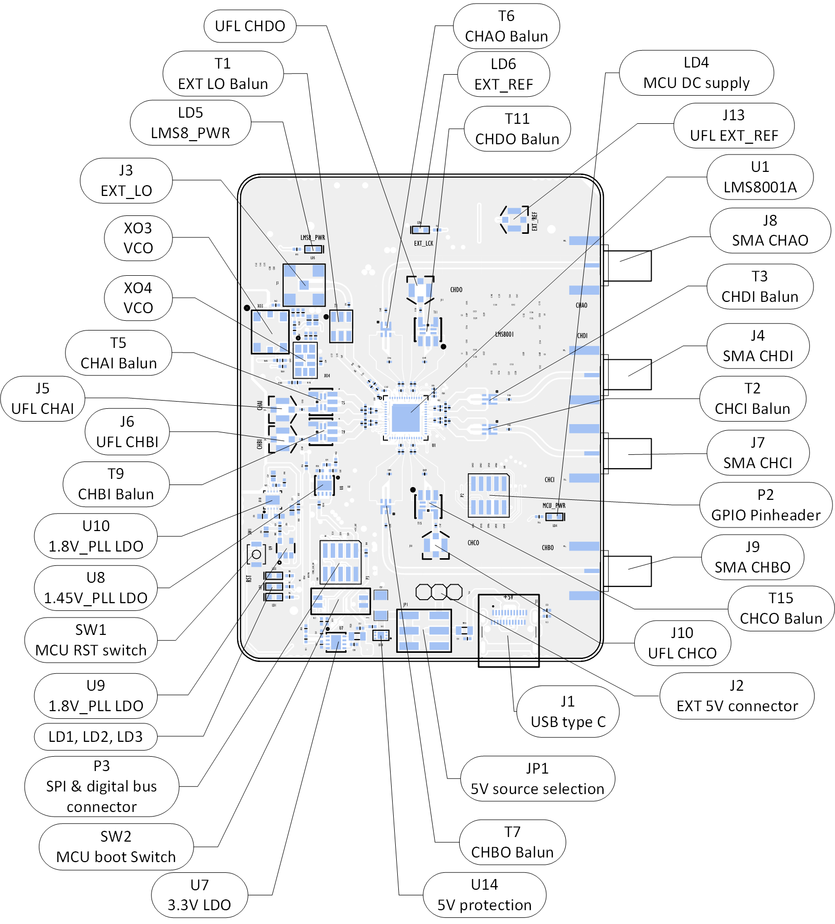 Figure 4. LMS8001 Companion 3v2 reverse connectors and main components.